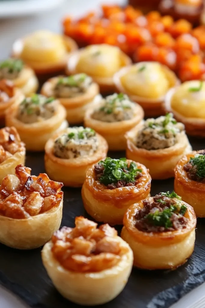 Mozzarella-Spieße, Caprese-Baguette, Mini-Tartelettes und Nutella-Blätterteig.
