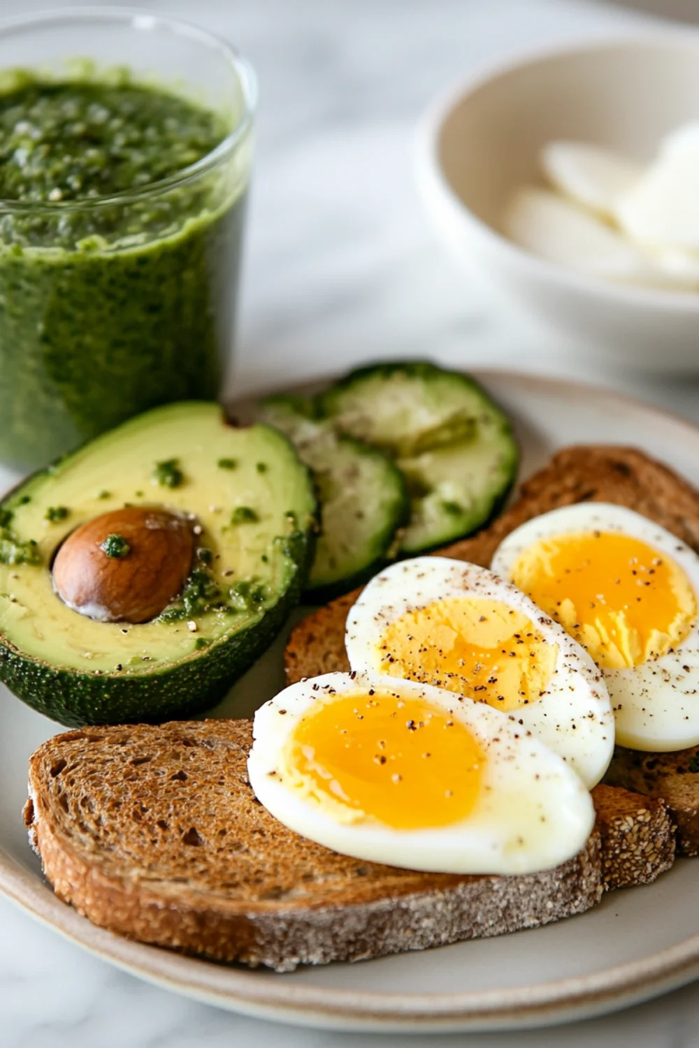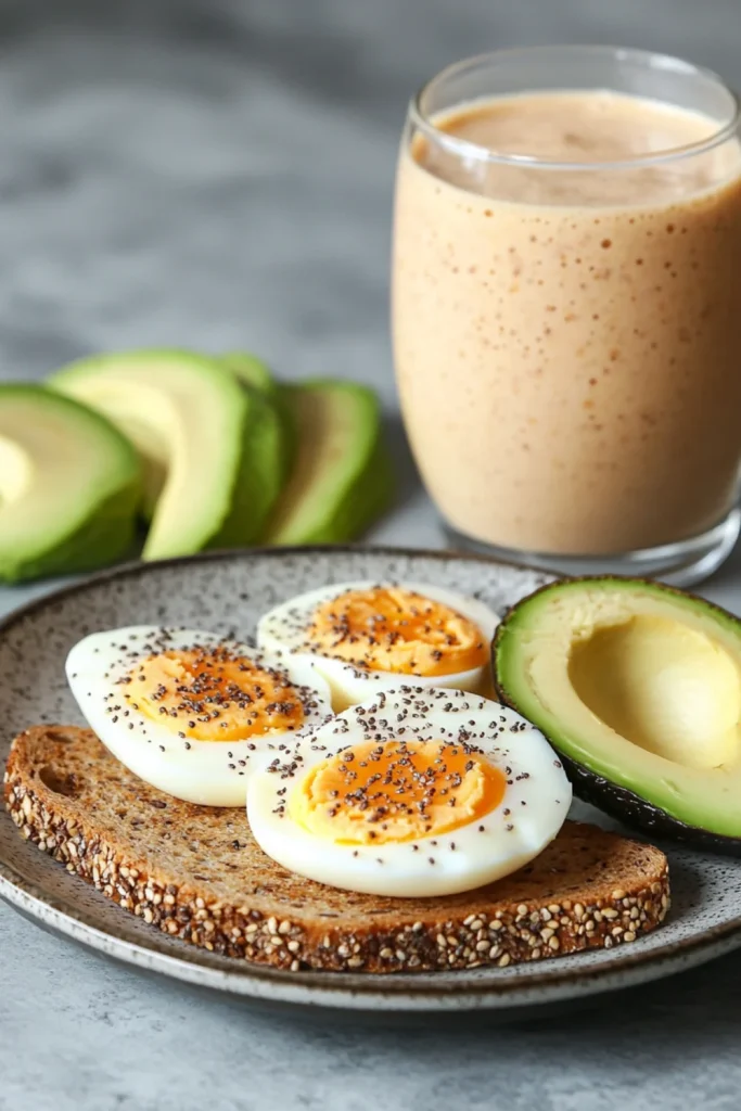Proteinreiches Frühstück mit gesunden Fetten und komplexen Kohlenhydraten, z. B. Eier mit Avocado oder Joghurt mit Nüssen.