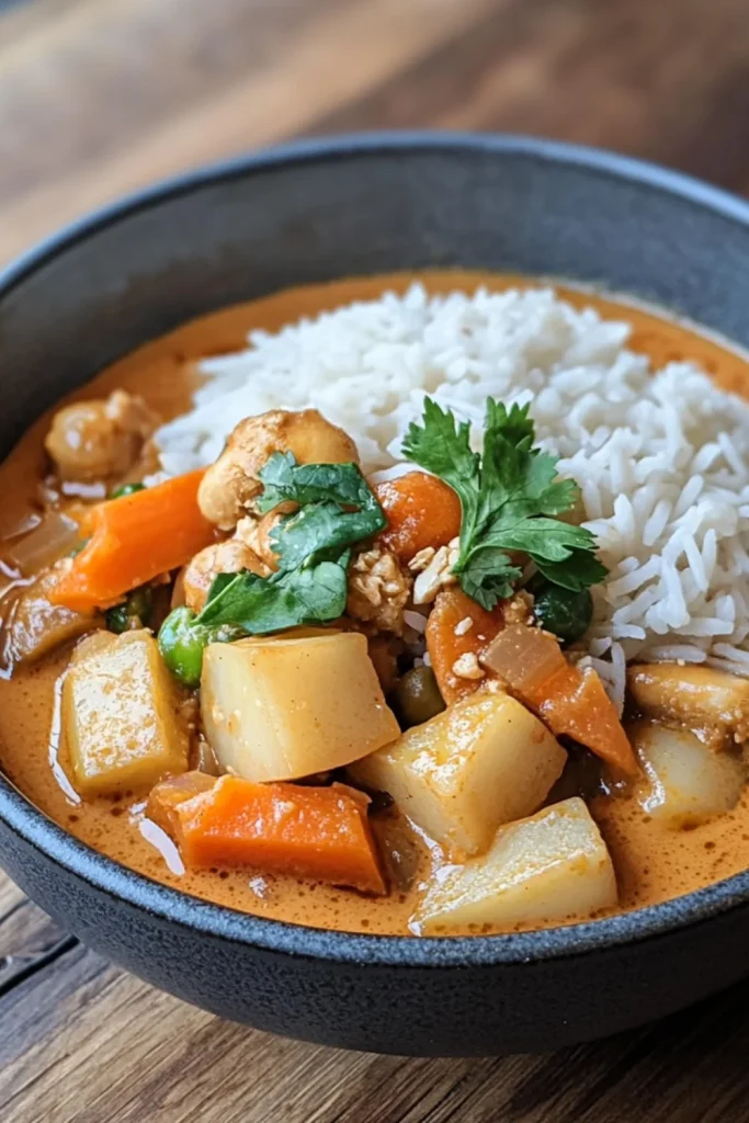Wenn du auf der Suche nach einem Gericht bist, das nicht nur deinen Gaumen verzaubert, sondern auch die Seele wärmt, dann ist Vegetarisches Massaman Curry genau das Richtige. Ursprünglich aus Thailand stammend, ist dieses Curry eine köstliche Mischung aus orientalischen und südasiatischen Einflüssen. Es vereint die herzhaften Aromen von Kokosmilch, aromatischen Gewürzen und knackigem Gemüse zu einer harmonischen Komposition.
